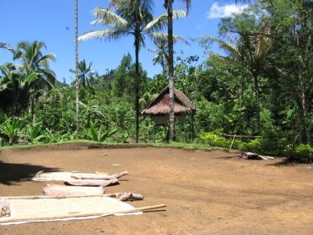 The picture has rice that is drying on the ground with the hausboi in the background where we stayed for the night. Once the rice has been dried, you husk the shell then you are ready to eat the rice.