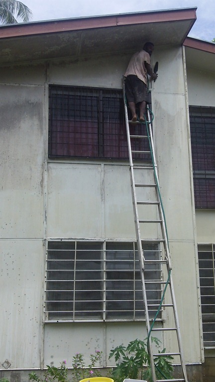 Gosel and I got our brushes, water bucks, and hose along with ladders positioned to wash the house. I let Gosel, a national workman, climb the ladder to wash the upper half while I washed the bottom half. We started with bleach water but soon found out we were washing off the paint. We then just stuck with water and a brush. The house was plenty dirty and a good brush job was going to be just fine.