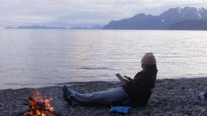 I bought this kayak in the spring of 2009 with hopes of many kayaking adventures in Alaska. The adventures have not failed as I have paddled next to tidewater glaciers, whales, sea otters, stellar sea lions, and passed many bald eagles. A few weekends ago Emily and I took my last opportunity to paddle and kayak with the ‘Lizard.’ We left on a Friday morning for a 6 mile paddle to Thumb Cove outside of Seward. After a short 3 hour paddle we landed on a private black sand beach in Thumb Cove. We spent the rest of the afternoon and evening resting and enjoying the day, beach side Alaskan style. Emily took a nap in the hammock and I went kayak fishing. Emily succeeded while the pink salmon were more interested in going upstream than taking my hook. That evening we enjoyed a nice beach campfire and played our favorite game of Skip-Bo. As the sun started to set just past 10pm, we retired to our tent for the night.