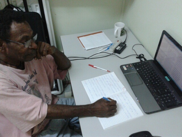 Siria was tasked to draft the book of Deuteronomy. Siria reads the Tok Pisin, then does his best as in the sense of drafting into his local language, Aruamu. This is the very first step in the very long process of Bible translation. Siria is pictured writing in his notebook and using the computer program, Paratext for language resources such as the Tok Pisin Bible. Later, he will type his rough draft of Deut. into the computer program for others to check and edit.